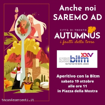 Come da tradizione, anche questanno nel ricco programma di Autumnus cè spazio per un piccolo anticipo delle Giornate del Turismo Montano: lappuntamento è per sabato 19 ottobre, dalle 11 alle 12 in Piazza Mostra, con Aperitivo con BITM.